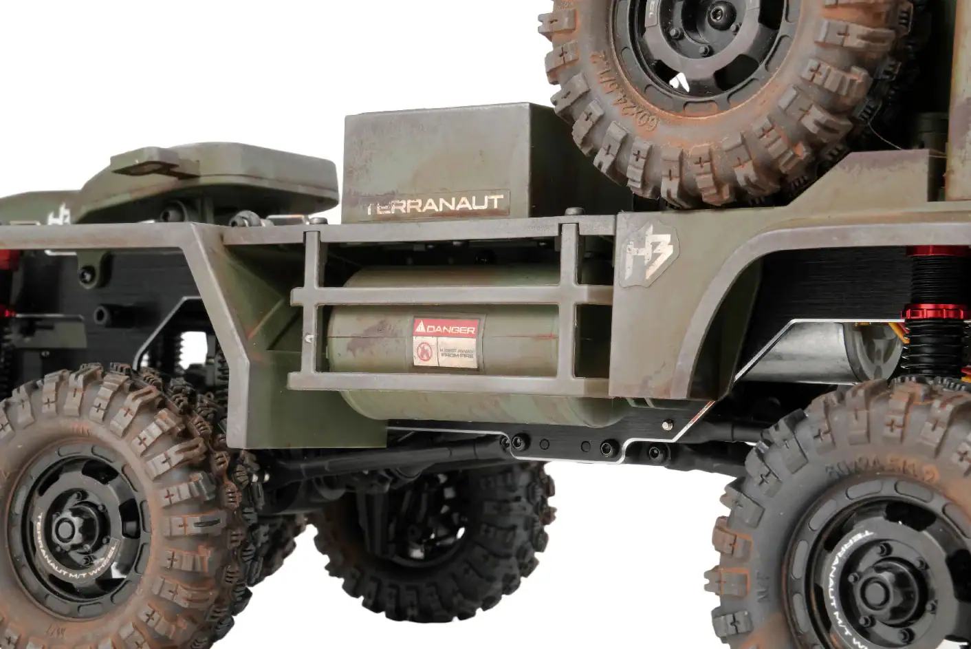 Underneath the weathered and rusted cosmetic updates, you'll find the same features and functions as on the stock CR18P Terranaut, including a two-speed transmission, 8-wheel drive, 8-wheel steering, portal axles, and a servo-winch-powered recovery hook.