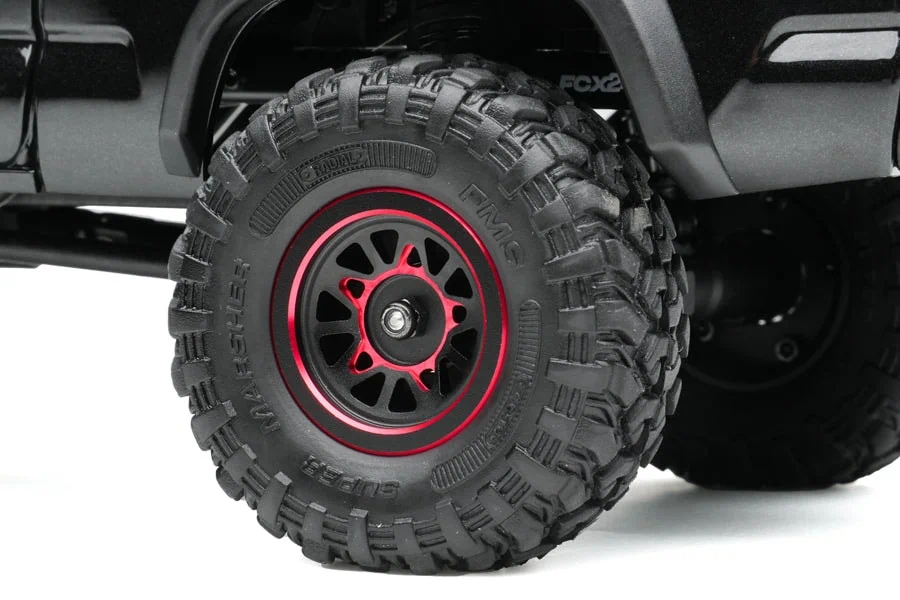 The Fair RC FCX24M Taco Black Mamba Mod RTR puts a dark spin on this already well-detailed truck, giving it a glossy black paint job and outfitting it with a new set of Batrazzi 0.9" Aluminum Night Racer Beadlock Wheels and larger tires. With their red accents and otherwise flat black finish, these tires are an excellent addition to an already stunning R/C truck.