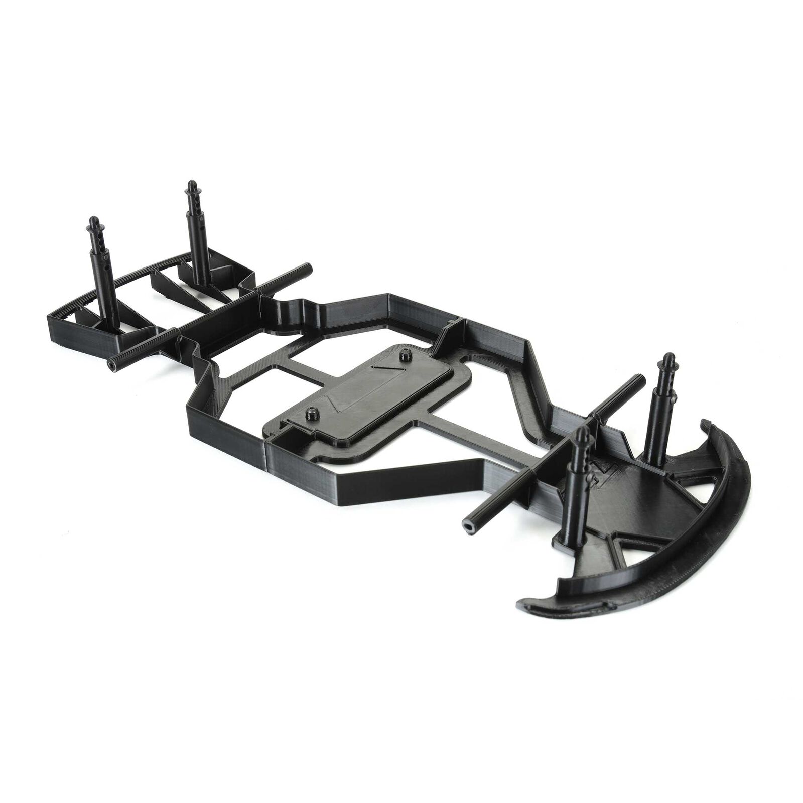 Made of black 3D-printed material, this multi-piece display chassis will simulate the appearance of a complete NASCAR chassis without any of the internals and moving components. The display stand includes a front splitter, rear diffuser, and mock axles to let you mount your NASCAR Cup Series or NASCAR Craftsman Truck Series body for full visual effect.